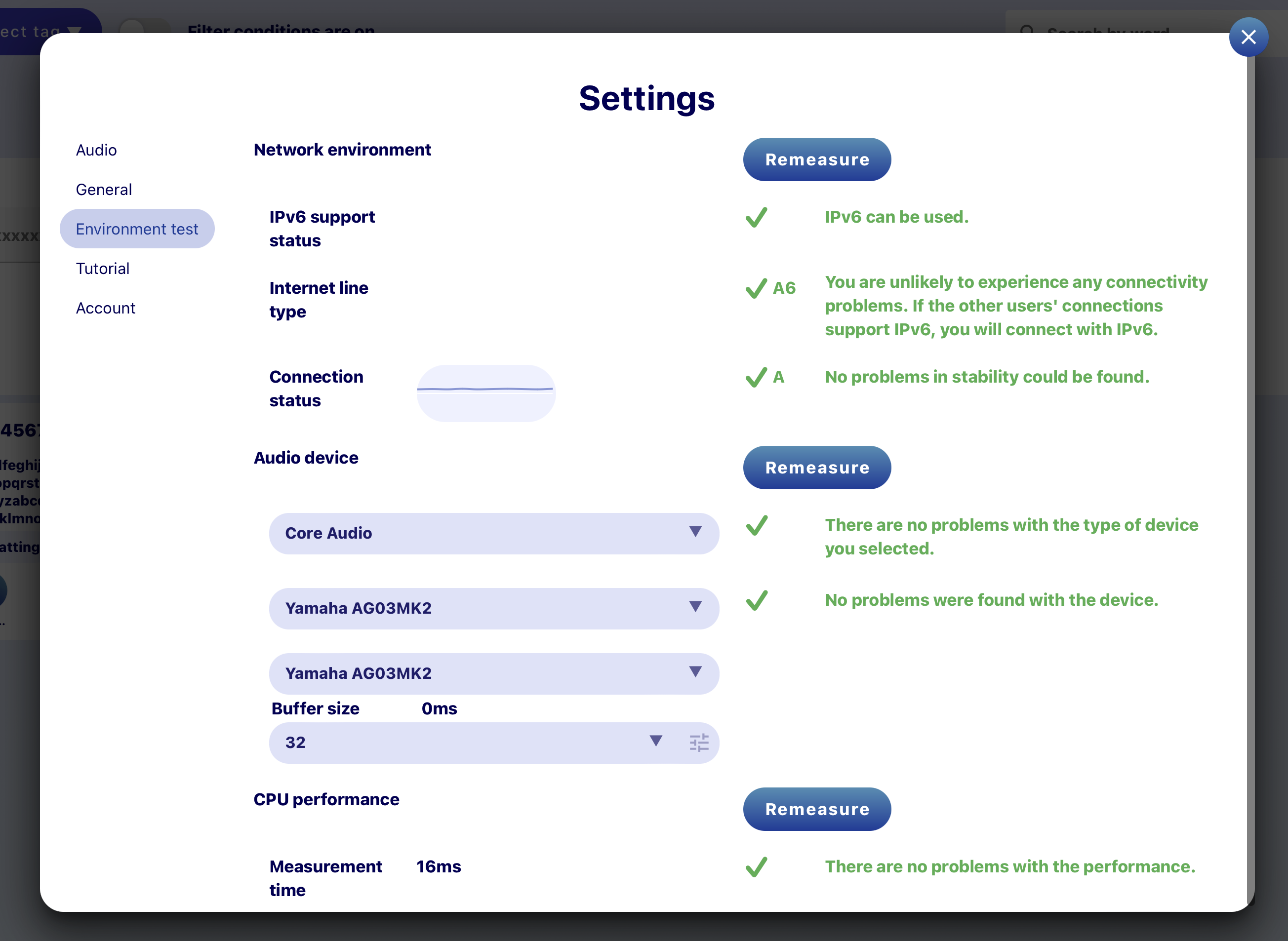 This checks the type of audio device you selected and its operational stability. You will need to reduce the buffer size for real-time sessions, but if it indicates that there are stability problems, increase the buffer size slightly and check again. Also see the following in the FAQ.