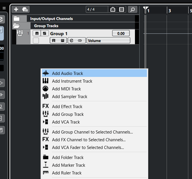 Then add an instrument track and load the VST instrument you want to use. After that, follow the same steps as the audio tracks described above to set the output of the VST instrument's track to the same group channel (Group-Group1).