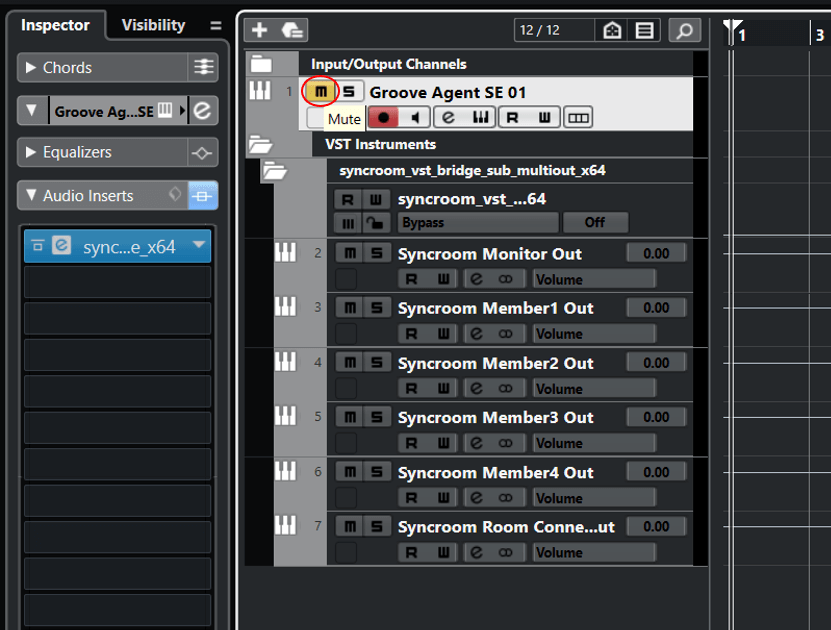 The multi-output settings are now complete, but since the original track (the track with the syncroom_vst_bridge2 inserted) and the output voice will be duplicated, so mute this.